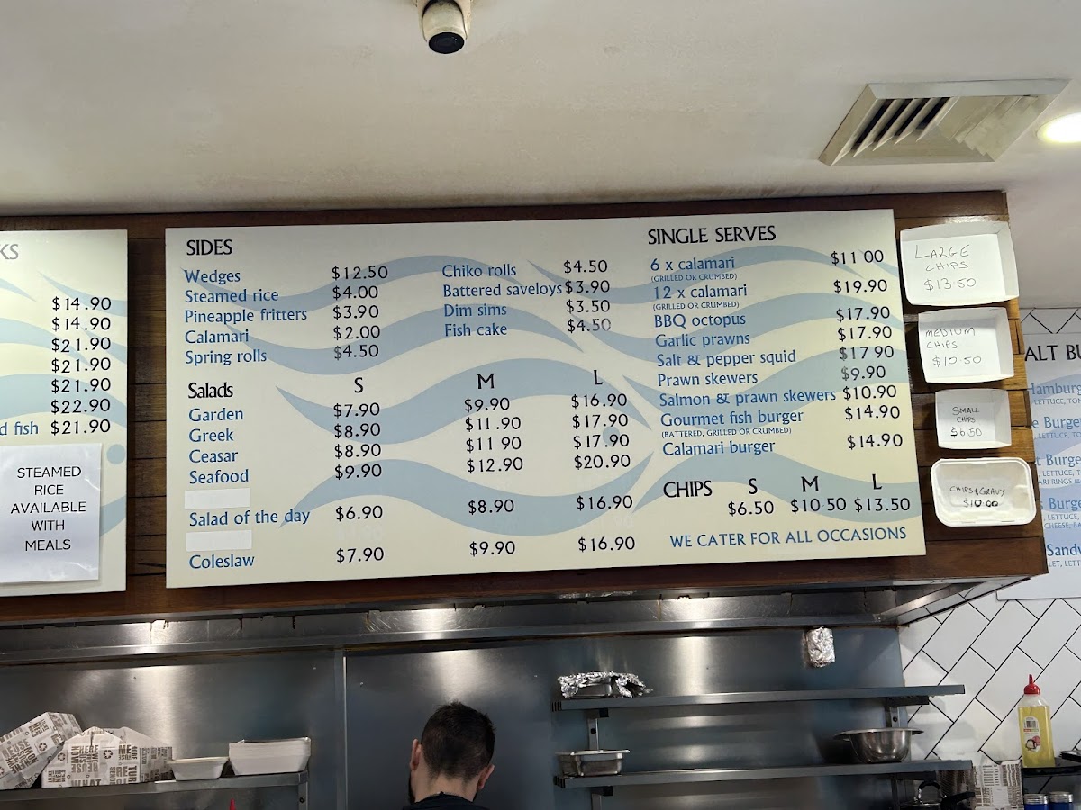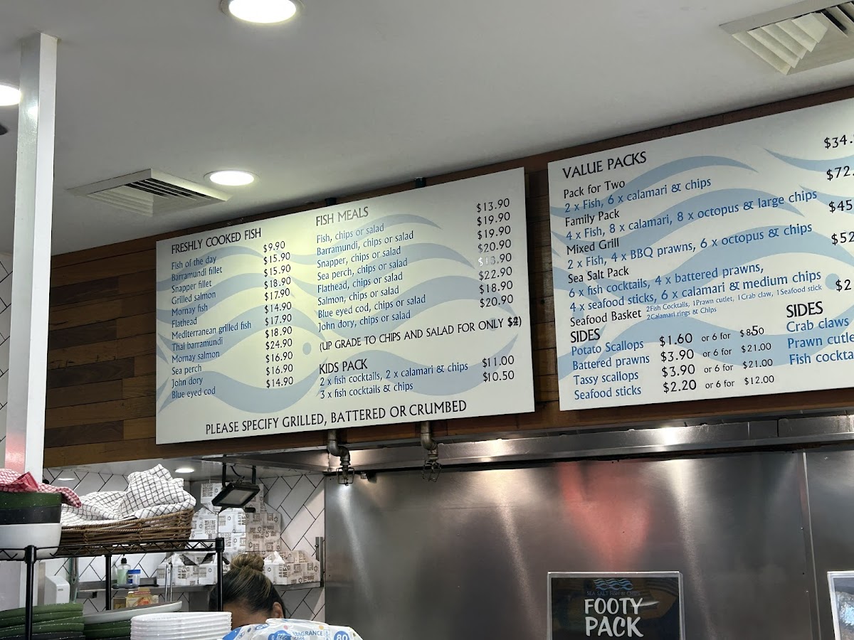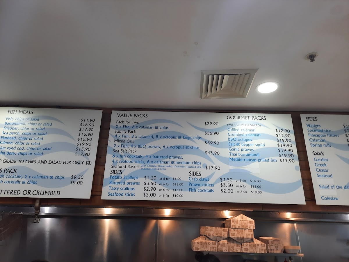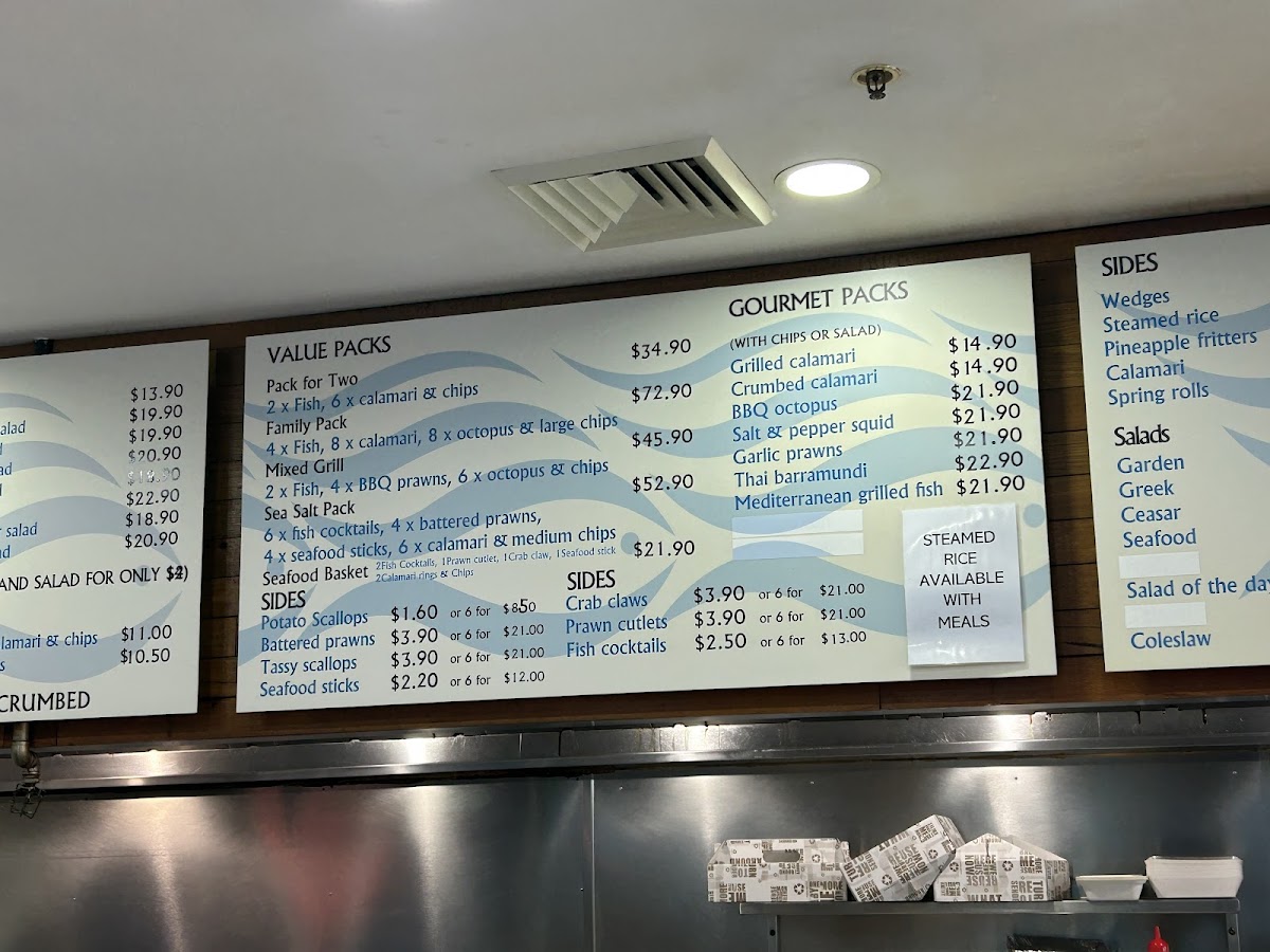 Sea Salt Fish & Chips at 665 Merrylands Rd offers a menu that caters to both traditional seafood lovers and those seeking something more gourmet. Their Fresh Seafoods section impresses with options like 12 X Oysters Mornay, 3 X Oysters Kilpatrick, 1/2 Kilogram Prawns, and 1 Dozen Pacific Oysters, alongside smaller servings such as 1/2 Dozen Pacific Oysters. Complementing these are a variety of Sauces, including Tartare Squeezie, Large Gravy, Homemade Tartare Sauce, Garlic Dip, and Sweet Chilli Sauce, perfect for enhancing any dish. The Sides menu adds texture and variety with Tassy Scallops, Spring Rolls, Calamari, Potato Scallops, and Fish Cakes, while the Salads-ranging from Coleslaw Salad and Greek Salad to Seafood Salad and Garden Salad-offer lighter, refreshing options. Burger enthusiasts are well-served with items like the Fish Taco, Plain Hamburger, CheeseBurger, Seasalt Burger, and Works Burger, each providing a satisfying alternative to traditional fish dishes. For those craving the mainstay of any fish and chips spot, the Fresh Cooked Fish section features John Dory Fillet, Sea Perch Fillet, Grilled Salmon, Fish Of The Day (Dory Fillet), and Barramundi Fillet, highlighting the quality and freshness of their offerings. Families can enjoy value through Family Value Packs, such as the Pack For 2, Sea Salt Pack, Kids Pack 2, Mixed Grill Pack, and Seafood Basket, designed for sharing. To round out the meal, a variety of Drinks are available, including Pump Berry Water, Mount Franklin Lightly Sparkling-Lemon, Mount Franklin Lightly Sparkling, Powerade 600ml Varieties, and Coca-Cola 330ml Glass Varieties. For those seeking a more elevated experience, the Gourmet Selection features inventive choices like Calamari Burger, Salmon & Prawn Skewer, Gourmet Fish Burger, BBQ Octopus, and Prawn Skewers, providing a modern twist on classic seafood fare. Overall, the menu at Sea Salt Fish & Chips blends traditional favorites with creative options, offering something for every palate.