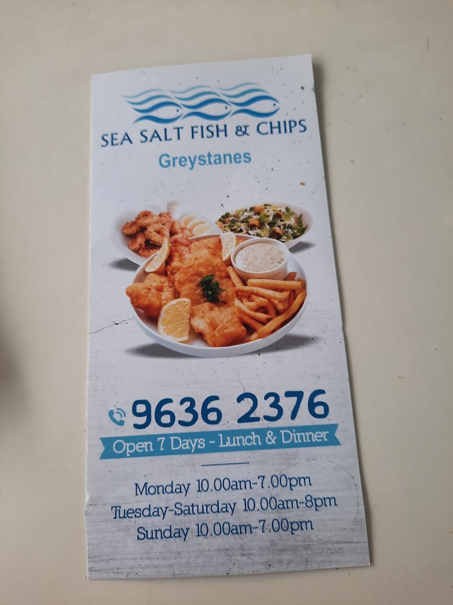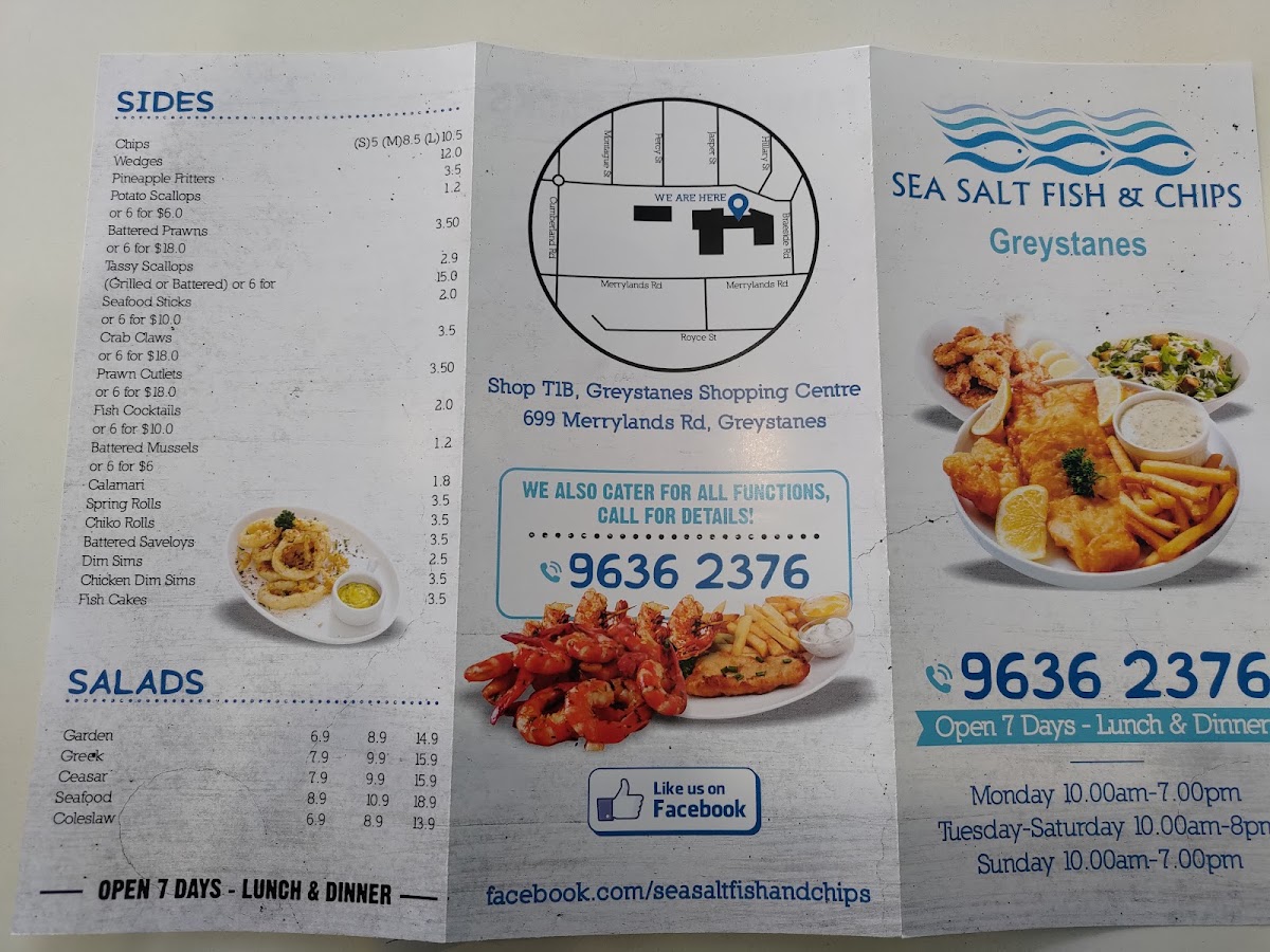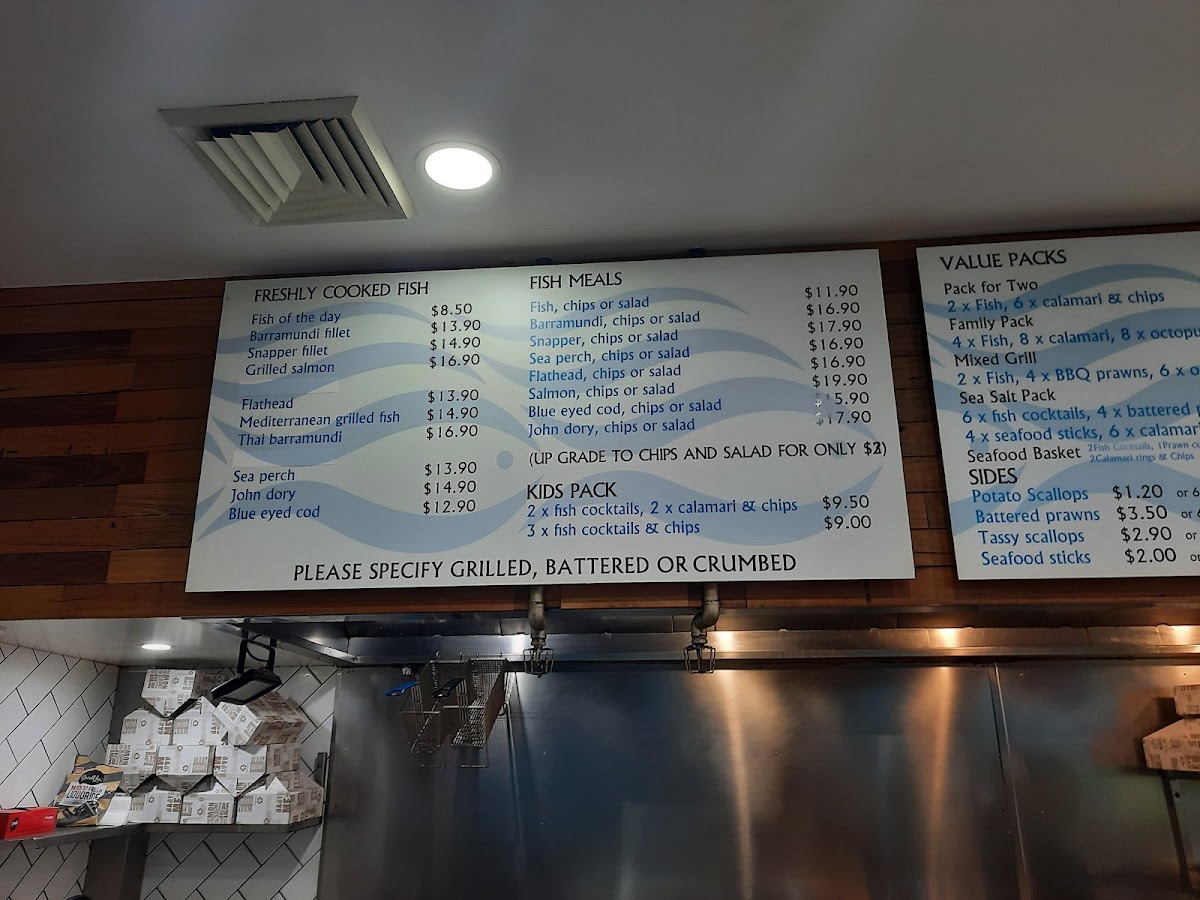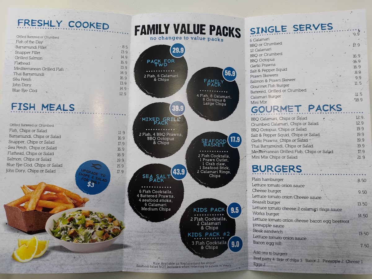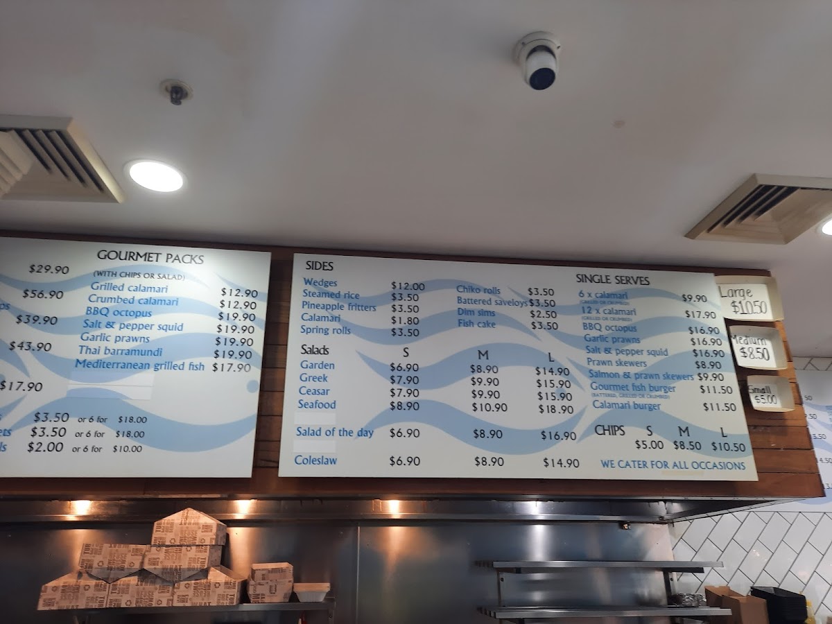 Sea Salt Fish & Chips at 665 Merrylands Rd offers a menu that caters to both traditional seafood lovers and those seeking something more gourmet. Their Fresh Seafoods section impresses with options like 12 X Oysters Mornay, 3 X Oysters Kilpatrick, 1/2 Kilogram Prawns, and 1 Dozen Pacific Oysters, alongside smaller servings such as 1/2 Dozen Pacific Oysters. Complementing these are a variety of Sauces, including Tartare Squeezie, Large Gravy, Homemade Tartare Sauce, Garlic Dip, and Sweet Chilli Sauce, perfect for enhancing any dish. The Sides menu adds texture and variety with Tassy Scallops, Spring Rolls, Calamari, Potato Scallops, and Fish Cakes, while the Salads-ranging from Coleslaw Salad and Greek Salad to Seafood Salad and Garden Salad-offer lighter, refreshing options. Burger enthusiasts are well-served with items like the Fish Taco, Plain Hamburger, CheeseBurger, Seasalt Burger, and Works Burger, each providing a satisfying alternative to traditional fish dishes. For those craving the mainstay of any fish and chips spot, the Fresh Cooked Fish section features John Dory Fillet, Sea Perch Fillet, Grilled Salmon, Fish Of The Day (Dory Fillet), and Barramundi Fillet, highlighting the quality and freshness of their offerings. Families can enjoy value through Family Value Packs, such as the Pack For 2, Sea Salt Pack, Kids Pack 2, Mixed Grill Pack, and Seafood Basket, designed for sharing. To round out the meal, a variety of Drinks are available, including Pump Berry Water, Mount Franklin Lightly Sparkling-Lemon, Mount Franklin Lightly Sparkling, Powerade 600ml Varieties, and Coca-Cola 330ml Glass Varieties. For those seeking a more elevated experience, the Gourmet Selection features inventive choices like Calamari Burger, Salmon & Prawn Skewer, Gourmet Fish Burger, BBQ Octopus, and Prawn Skewers, providing a modern twist on classic seafood fare. Overall, the menu at Sea Salt Fish & Chips blends traditional favorites with creative options, offering something for every palate.